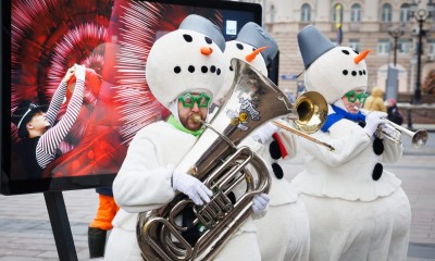 Открытие выставки прошло в «клоунской» манере. Под рождественские мелодии в исполнении концептуального музыкального театра Tinto Brass Band в костюмах снеговиков клоун Авабука (Павел Алехин) экспромтом показал номер, вовлекая прохожих и детей. В качестве реквизита он использовал обычную метлу, которую попросил у дворников на бульваре, — жест вполне в духе самого Карандаша.